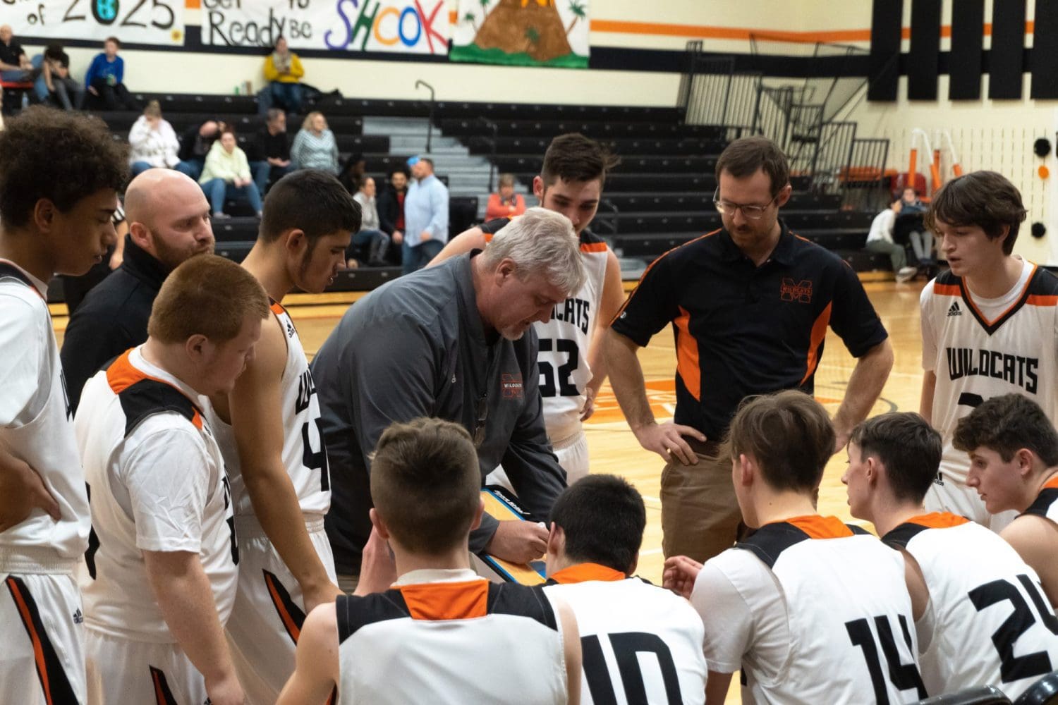 Wildcats Head Coach Troy Kahler with Assistants Christian Hutson (at left in black shirt) and Christopher Reed (at right in black shirt) go over details with the team during a timeout.