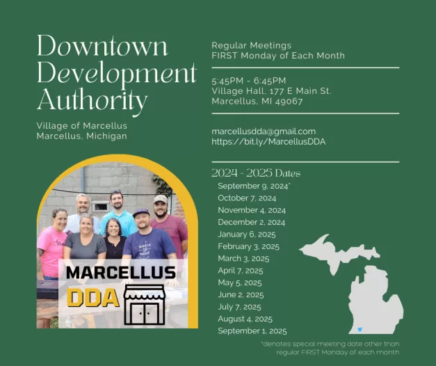 The Marcellus Downtown Development Authority voted recently to alter the regular meeting schedule from Thursdays to Mondays. While the September meeting will be held Monday, September 9, 5:45pm, due to Labor Day, all subsequent meetings … [Read more...] about DDA votes to alter meeting schedule