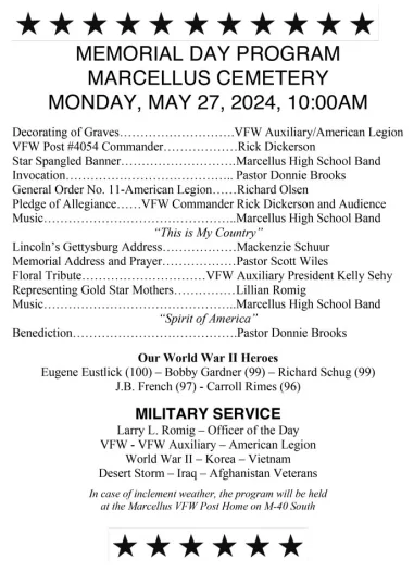 Supervisor Koshar called the special meeting to order at 3:00 for the purpose of passing an amendment to our adult and medical marihuana ordinance. Roll Call: Koshar, Schick, Hess, and Plummer. Absent: Mroz Motion by Schick, seconded by … [Read more...] about Marcellus Township Special Meeting, April 18, 2024