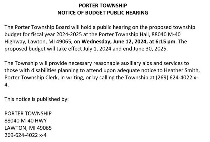 Supervisor Oxley called the meeting to order at 7:00p.m. Members present – Oxley, Bitely, Nesbitt, Packer, and Smith. Also present – Attorneys Tonya Schuitmaker and Chris Moraitis, and nine guests. Motion by Bitely with support by … [Read more...] about Porter Township – Van Buren County – Regular Meeting, April 10, 2024