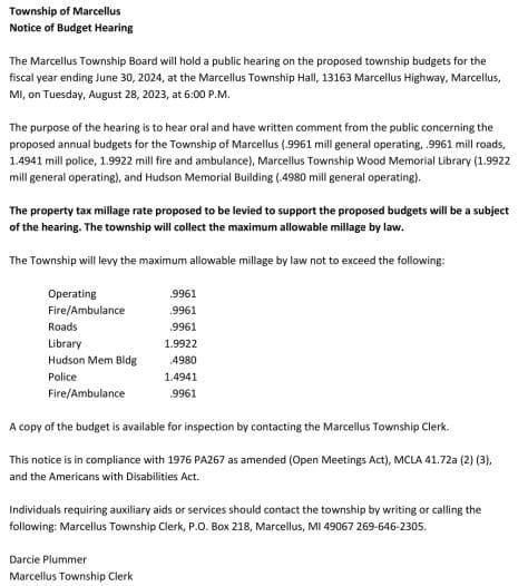 President Irwin called the regular meeting of the Marcellus Village Council to order at 7:00 p.m. on July 25, 2023, in the Marcellus Village Hall Council Room. Trustees present: Markle, Engstrom, Welburn, Thomas, Haley and … [Read more...] about Village of Marcellus Council Proceedings – Regular Meeting, July 25, 2023