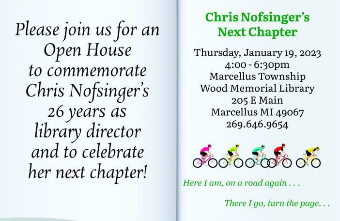 The public is invited to an open house for former Marcellus Township Wood Memorial Library Director Chris Nofsinger on January 19. Nofsinger starts a new chapter next month when she begins a cross country biking adventure from St. … [Read more...] about Nofsinger Set to Saddle Up for the Next Chapter