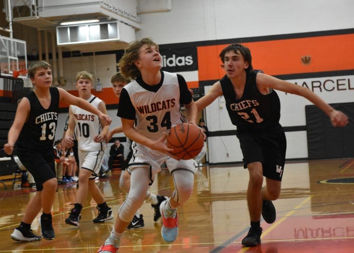 The boys 8th grade basketball team was also victorious Monday, November 28, against the visiting White Pigeon Chiefs, 40-20. #34 Cale Hackenberg has his eyes on the hoop against Chiefs’ defender, #21 Keagan Karp. Photo by Elin … [Read more...] about Marcellus Media Club Reports on Sports