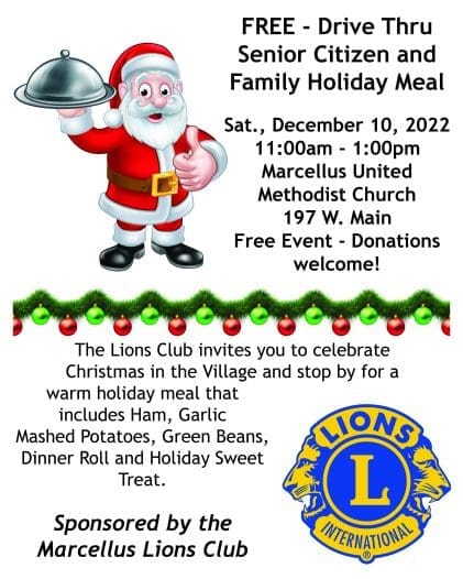 Marcellus Lions Club Drive thru Meal for Senior Citizens and families Home Arts Club to MeetThe Home Arts Club will meet on Monday, December 5, at The Rock. The meeting will begin at 5:30 for cocktail hour with dinner at 6:30. Members … [Read more...] about Community Announcements