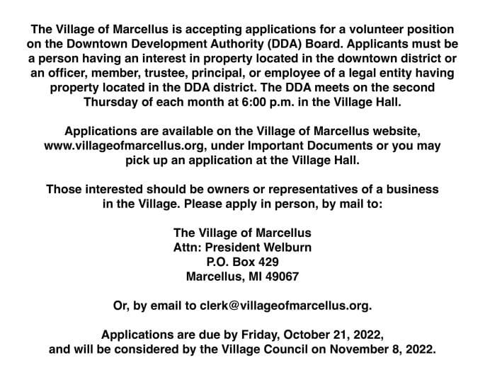 The Marcellus Downtown Development Authority is in need of three candidates to fill vacancies on the nine member board, which meets the second Thursday of each month at 6:00pm, in Village Hall. The volunteer position is open to … [Read more...] about DDA Seeks to Fill Vacancies