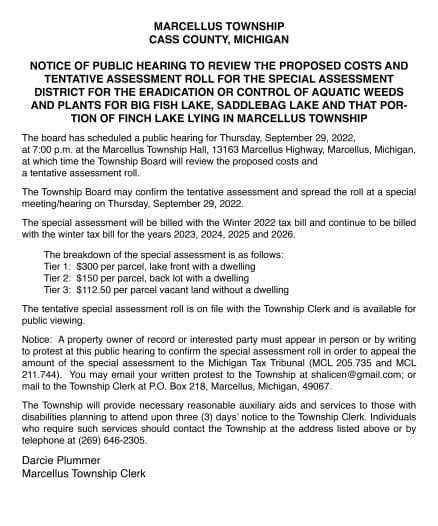 Public Hearing August 10, 2022 Supervisor Oxley called the Cedar Lake Weed Special Assessment District Public Hearing to order at 6:30 p.m. Members present- Meade, Oxley, Bitely, Nesbitt and Packer. Also present – Attorney … [Read more...] about Porter Township – Van Buren County, MI