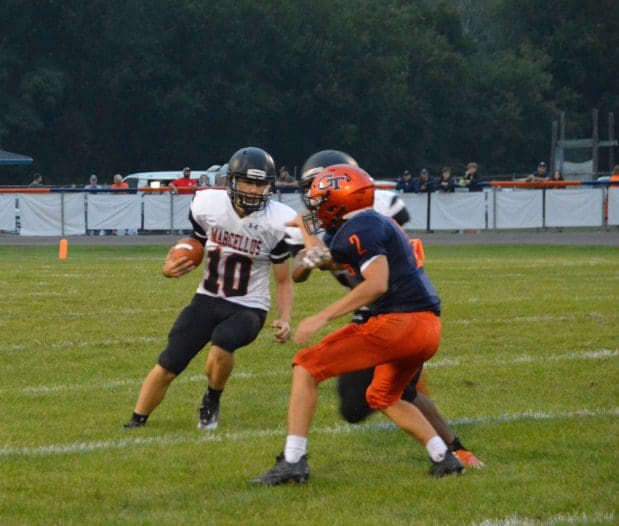 Sophomore Wildcat Quarterback #10 Parker Adams looks for a hole in the Gobles’ defense Thursday, August 25, during Marcellus’ season opener.Photo courtesy of Megan Schuur Photography submitted by Don PriceAthletic Director The varsity … [Read more...] about Wildcats Open the Season in Gobles: Tigers take the “W” 30-13