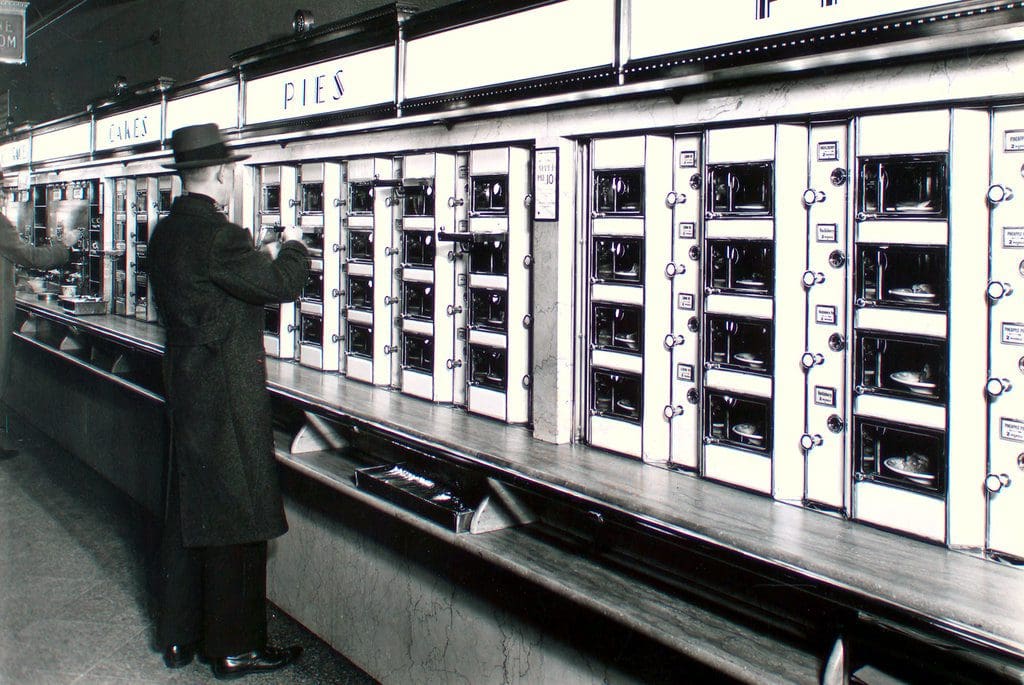 One of the first fast-food restaurants was the Automat. I think one of the best places to see an Automat in action is to watch the movie ”Touch of Mink.” Doris Day and Audrey Meadows have some great scenes in the Automat. It was a personal vending machine.