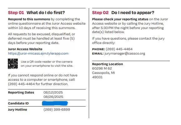 The new postcards will list Cass County Courts, 60296 M-62, Cassopolis, as the return address. The back of the card includes a QR code and URL directing recipients to the Juror Access website. Those without a smart phone or internet access may call (269) 445-4464 for more information.