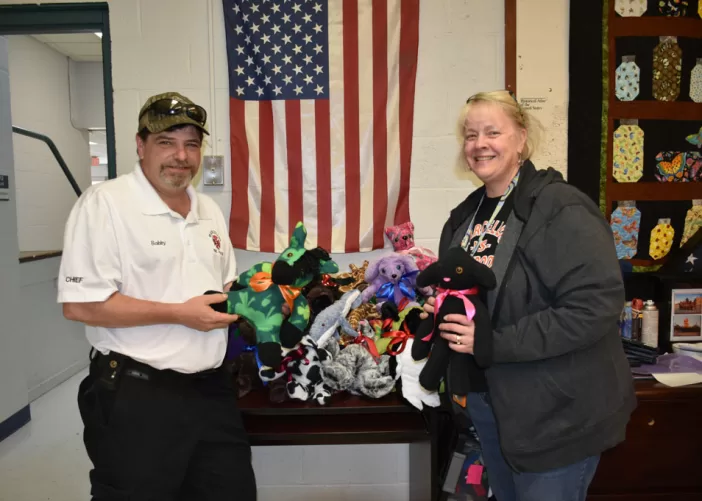 Middle school students donate hand made stuffed animals to Marcellus Fire Department