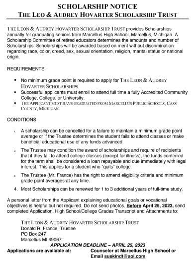 Scholarship Notice: The Leo & Audrey Hovarter Scholarship Trust