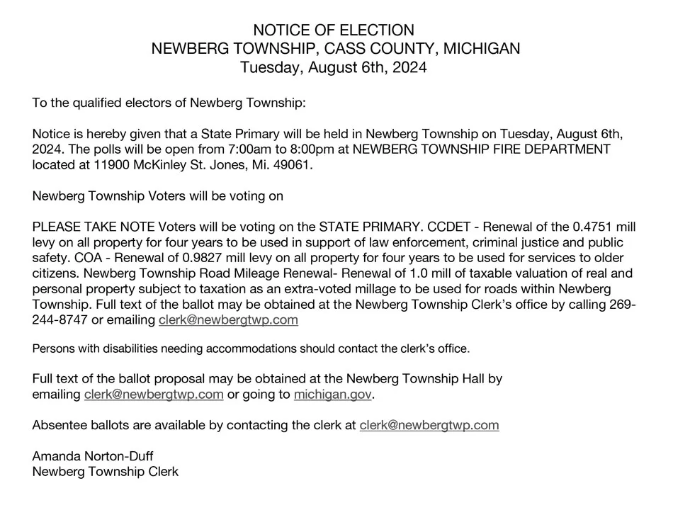Notice of Election – Newberg Township, Cass County, Michigan July 16, 2024 By Marcellus News Leave a Comment