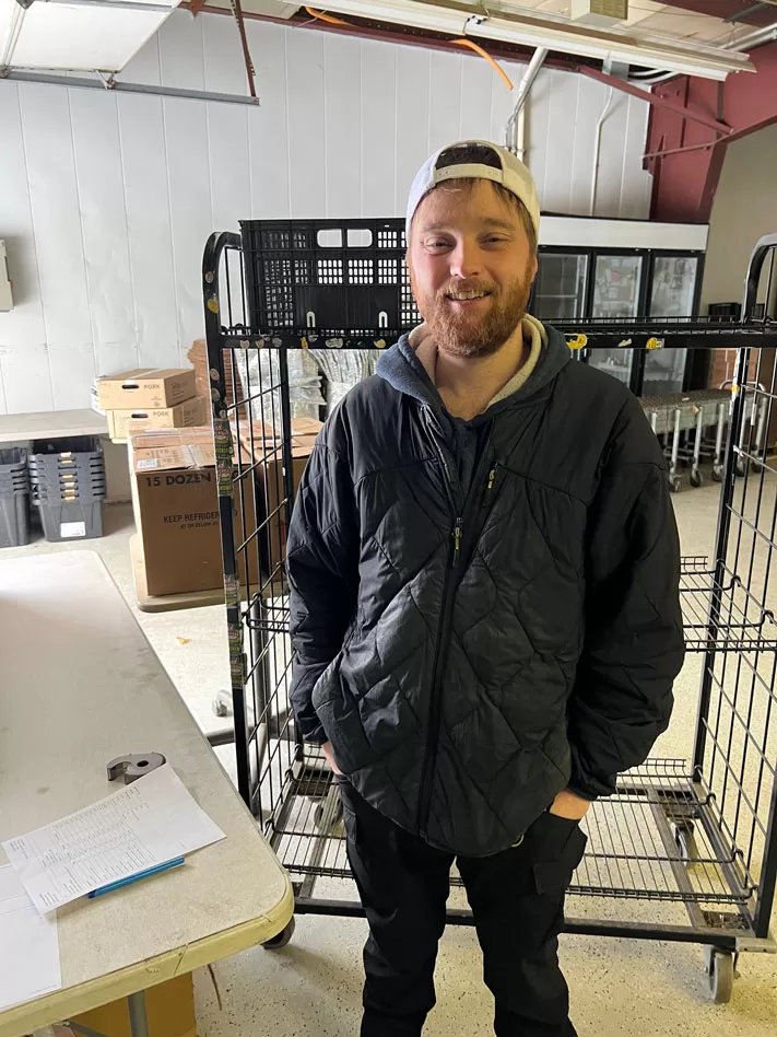 Doorganics General Manager Travis Hensen, pictured, helped unload the almost 200lb order of items such as Applewood Bacon, Boneless Pork Shoulder Roast, Bratwurst, boneless ham slices, and smoked ham roast, plus 132lbs of Hebron Farm eggs. -News Photo