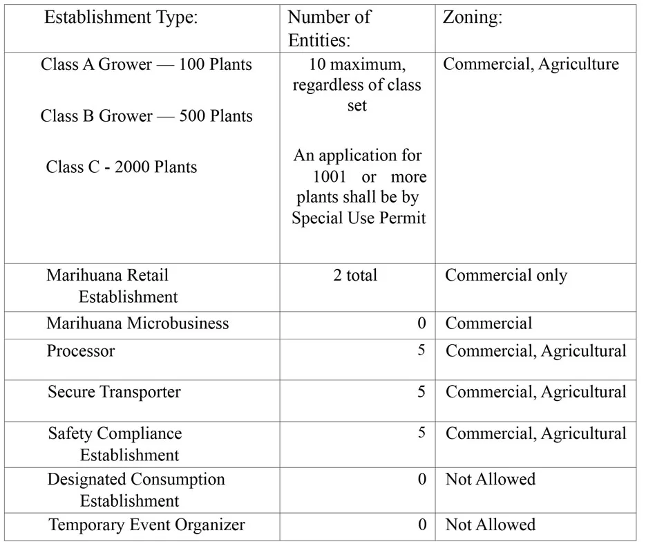 SECTION 3. Authorization of Establishments and Fee A. The maximum number of each type of marihuana establishment allowed in the TOWNSHIP OF PORTER shall be as follows: